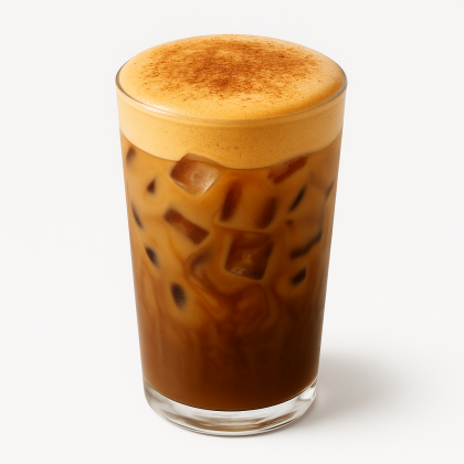 Iced latte made with Maple Syrup & Brown Sugar Cinnamon flavoring topped with Pumpkin coldĀ foam and cinnamon sprinkle